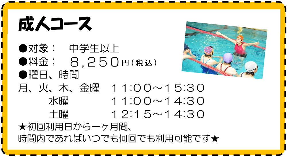 また、フリースイム・フリーウォーク・25m以上泳げない方・長い距離泳ぐ方等、コース分けがしてありますので、自分のペースで泳ぐことができます。